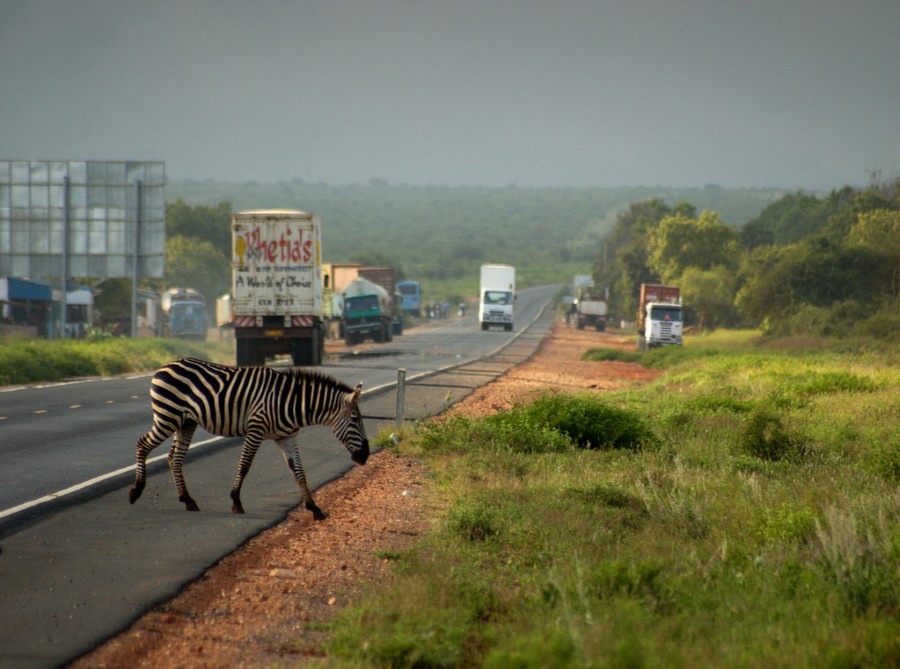 Rýchlostná cesta blízko hlavného mesta Nairobi. Niekde majú medvede a niekde zebry.