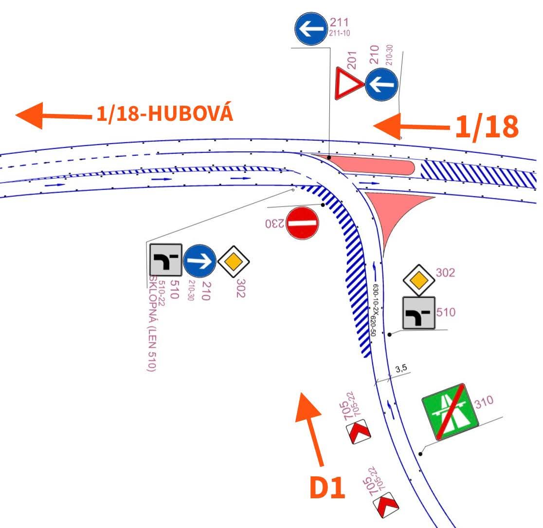 Na zjazde z diaľnice mala byť Z 301 a na I/18 zo Žiliny značky Z 201 Daj prednosť v jazde, príp. Z 202 Stop. Záleží na rozhľadových pomeroch v tej zlej križovatke.