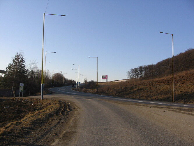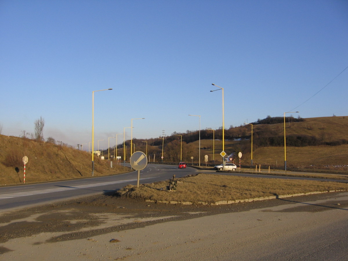 Pohled ze silnice na Margecany, vlevo smer na Poprad, vpravo do Prešova. Sloupy větve křižovatky