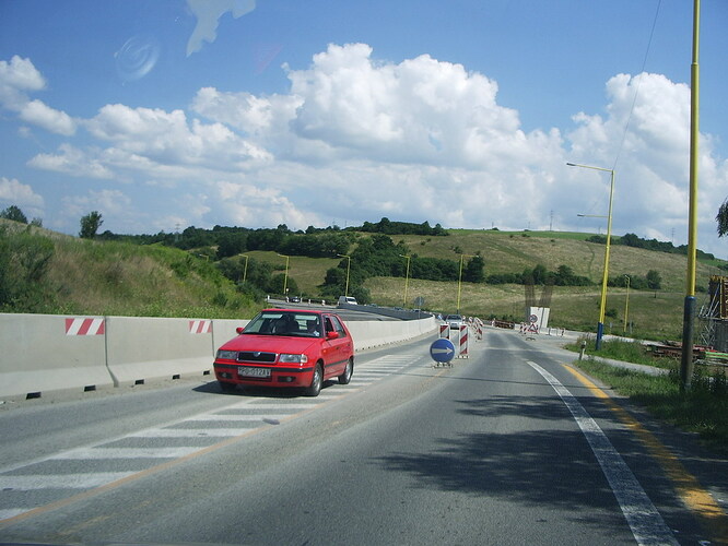 Na tomto useku asfaltova vrstva konci a vidiet novu farbu zabradia pouzitu na tomto useku