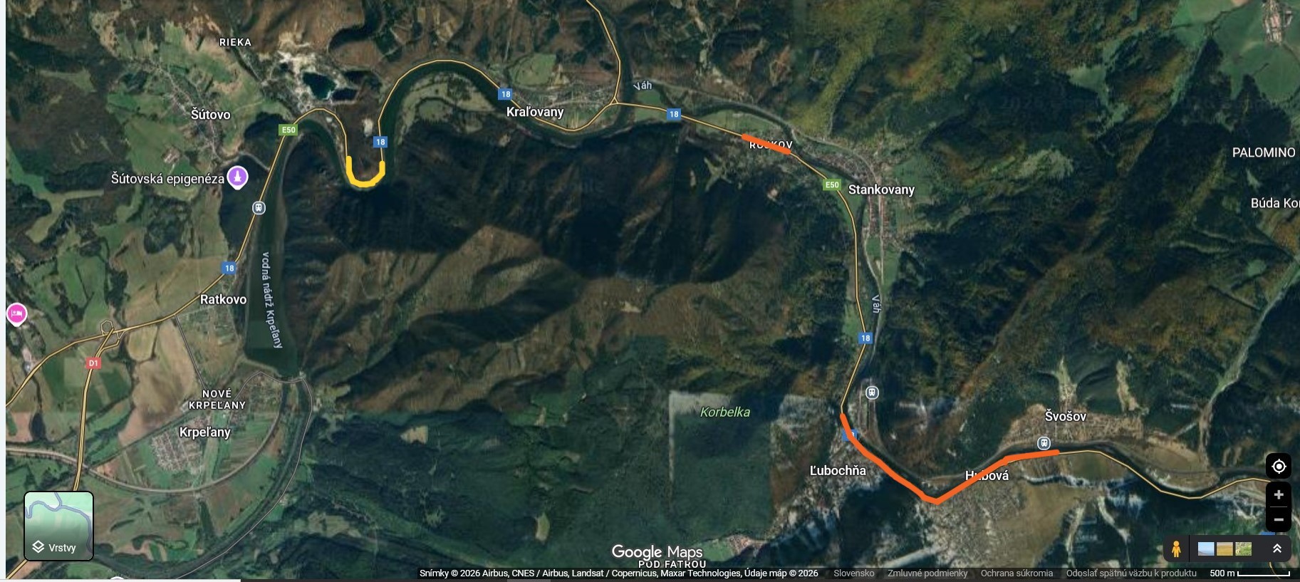 jedine znizenie z dovodu terenu je asi 700 metrov zakruta v meandri. potom je tiez asi 700 metrov cez rojkov. a potom az 2,5 km hubova-lubochna, ked cesta ide na okraji obci a dokonca 50ka je aj na par sto metroch v lese medzi tymito obcami, co je uplne smiesne. ziadne 50ky z dovodu prudach zakrut alebo prevysenia. jedine fakt uzke miesto je ten meander, tam by bol tunel s par 100 metrami. takmer 9 km tunelov kvoli 3 dedinam a zakrute je vlastne visnove2, 2 znamena ze 2x tak drahe.