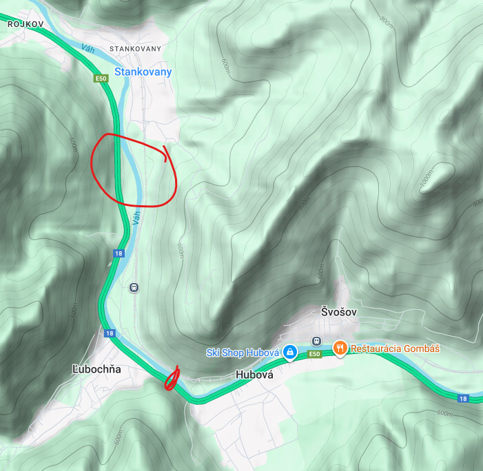 Z Hubovej by to slo premostenim ponad Vah a lemovat Svosov z juhu asi na pilieroch nad Vahom. Ale potom sa treba vtesnat asi opat na pilieroch ponad Vah severne od Hubovej. No pri Lubochni si to absolutne neviem predstavit… A dodrzat polomery…. Potom asi juom okolo Rojkova, co by znamenalo terenne upravy, abo opat estakadou nad Vahom zobrat severne Rojkov… Potom severne zobrat Kralovany a premostenie Vahu po jeho Juznom brehu tahat az k dalsiemu premosteniu ahu ale tam uz musi byt tunel… a nejako vyst juzne od moterustu Rieka a smerovat to juzne od Sutova. Ten tunel bude musiet byt asi nad cestou a zpilierov sa pojde priamo do portalu.