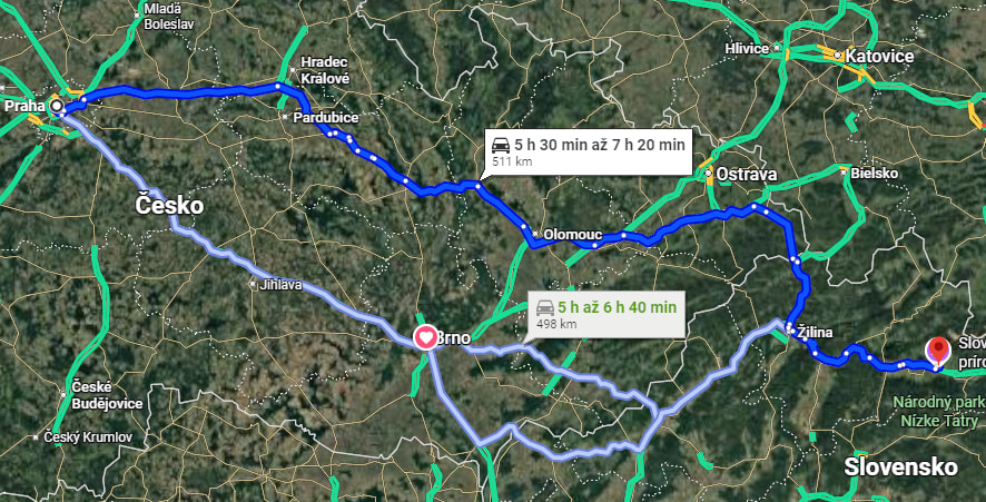 Na taku dlhu trasu ani navigacia nemusi byt spravna, kedze v dobe odjazdu moze byt zla situacia okolo Brna a bude ta to posielat po D35, kym by si ale dosiel do Brna, tak ta situacia uz bude zase uplne ina.