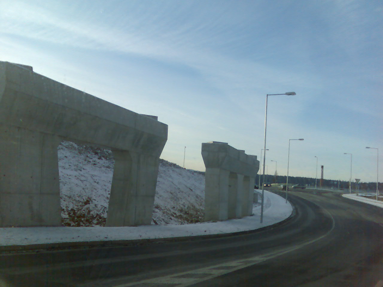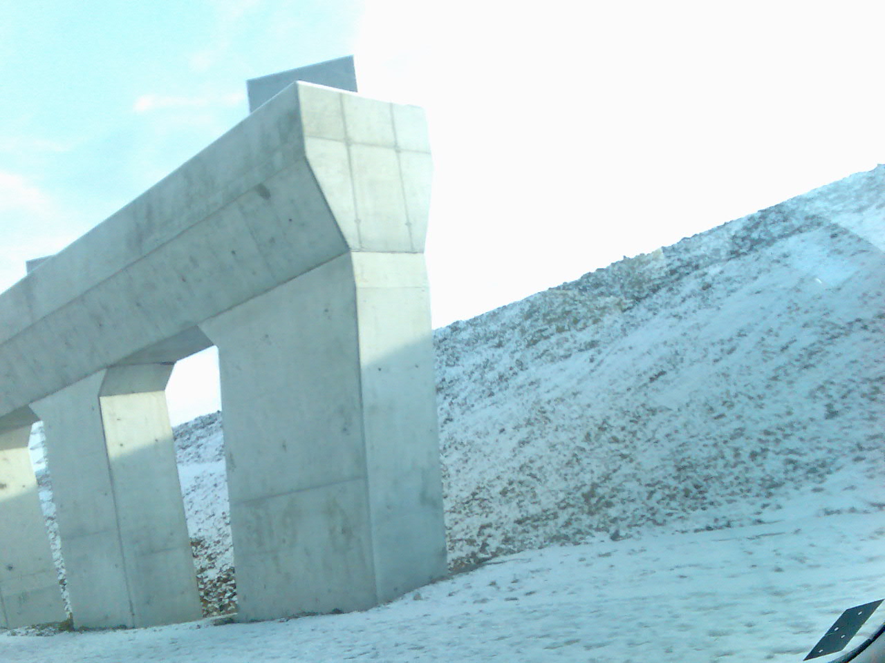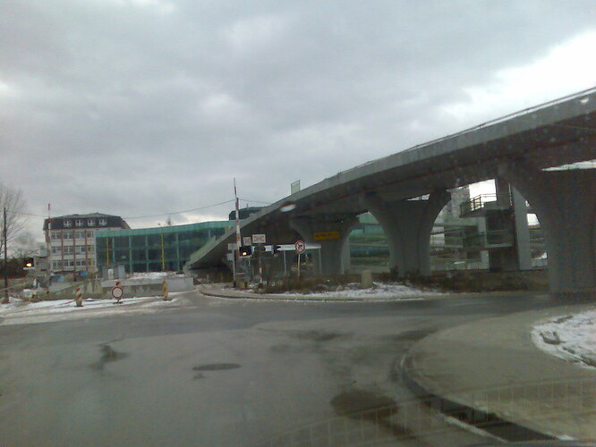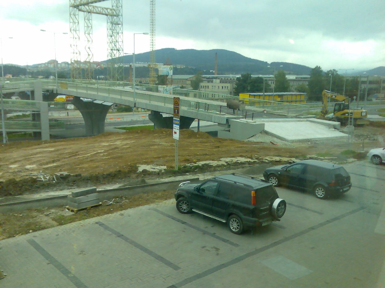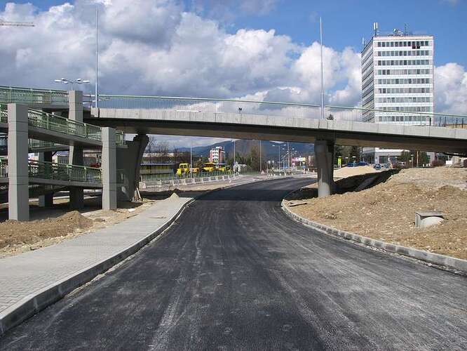 Výstavba križovatky z mostného prepojenia. Vľavo prechádza DP z centra. Druhý dvojpruh nie je spojený v súvislosti s napojením na mestské komunikáciu. V hornej časti je vo výstavbe kruhová križovatka.