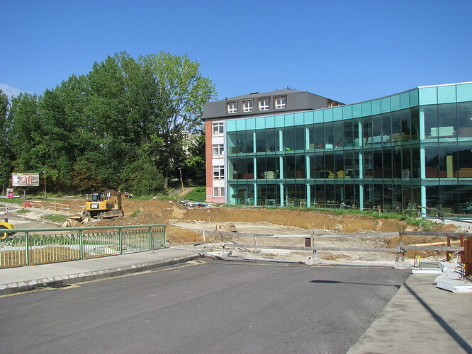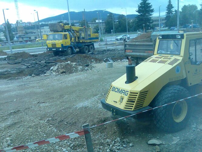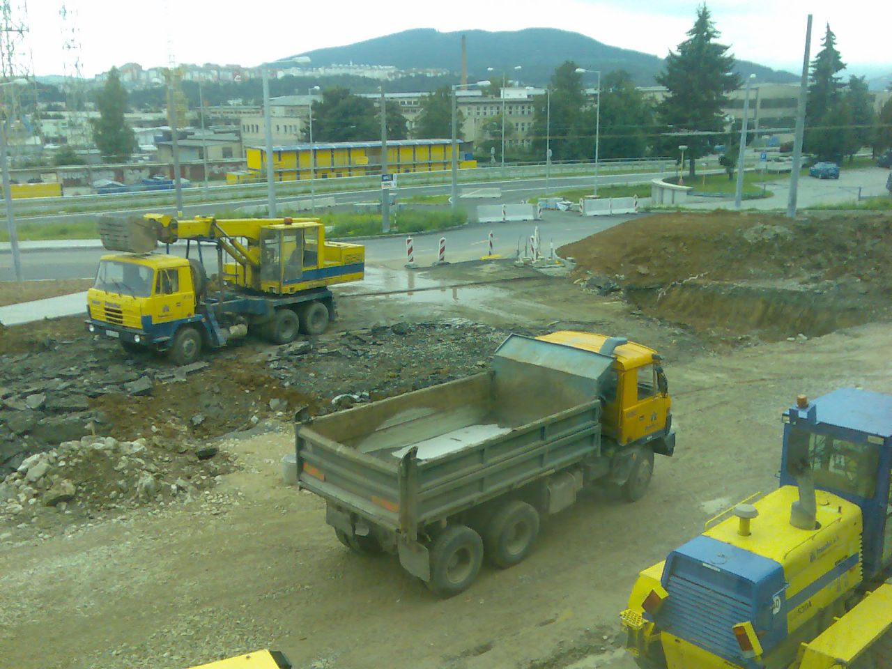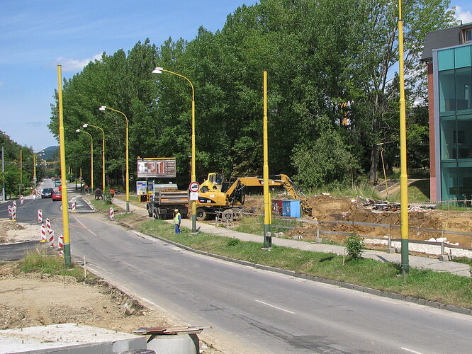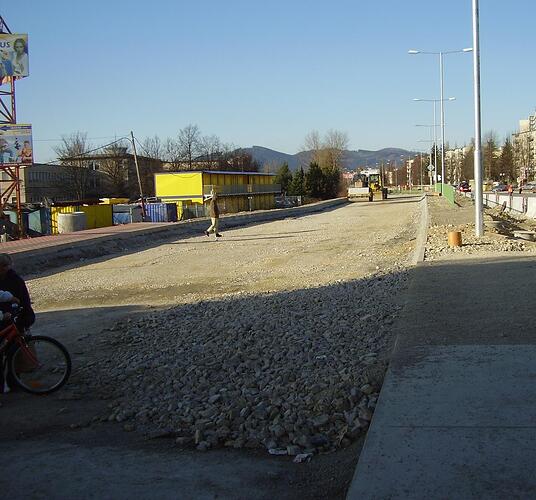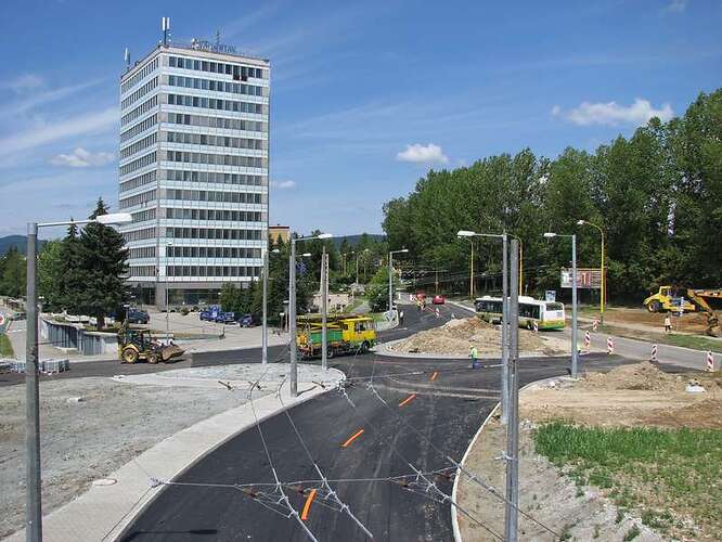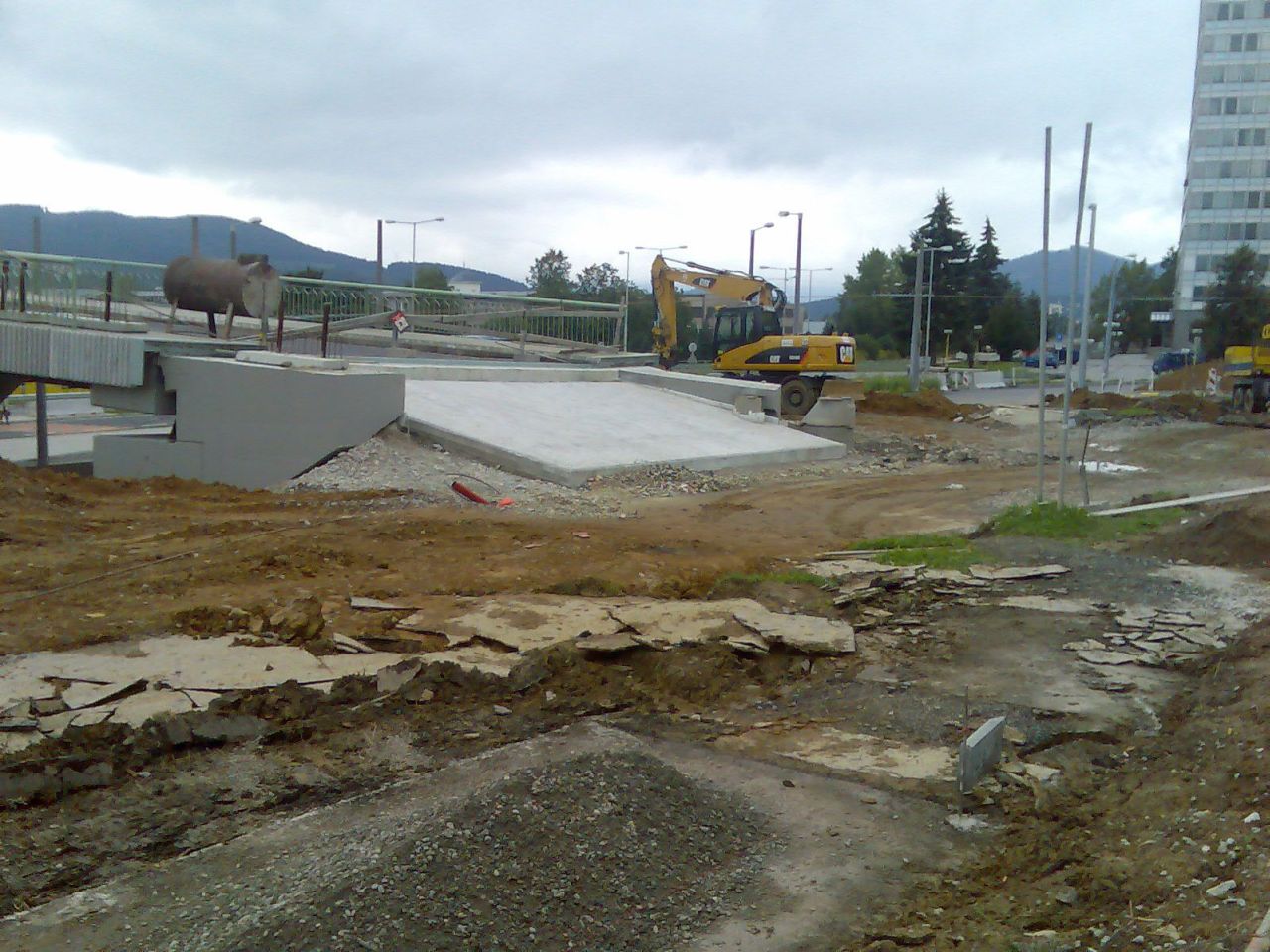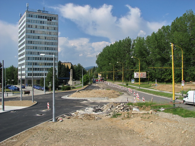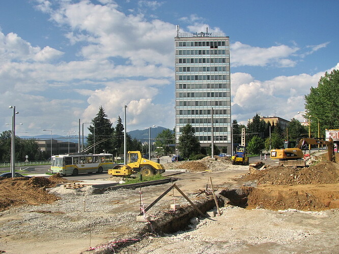 Pokračovanie prác na mestských komunikáciách v križovatke Váhostav. Vľavo prechádza DP LL-ZA a vpredu je výstavba nového cestného prepojenia z Hlinskej ul. (centrum) smerom na sídlisko Solinky. Pôvodná komunikácia prechádzala vpravo, ale v uvedenom priestore bude zaústenie z mostného prepojenia. Na tento nový úsek bude presmerovaná aj trolejbusová doprava.