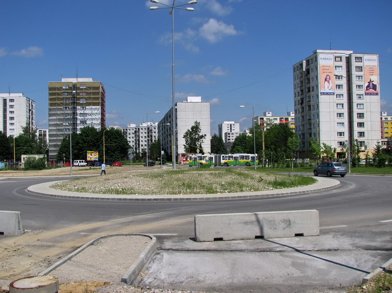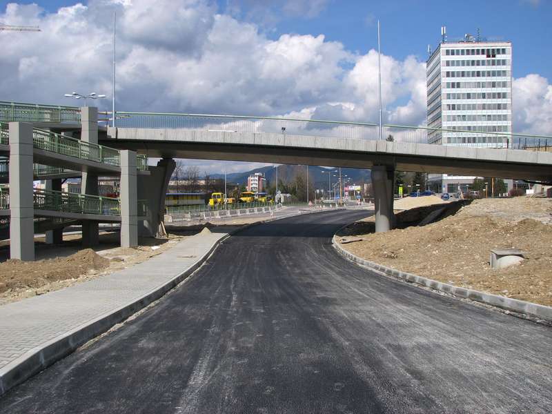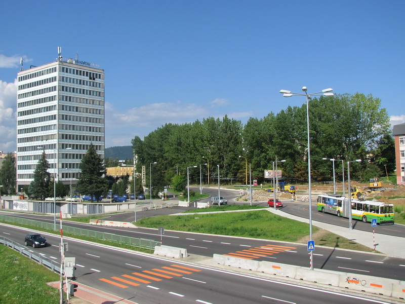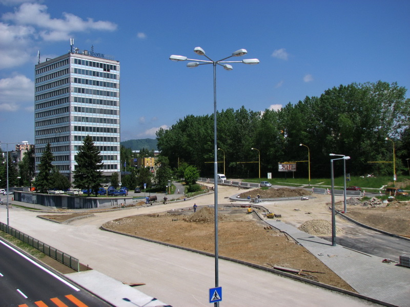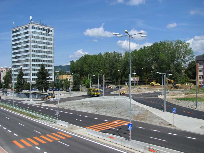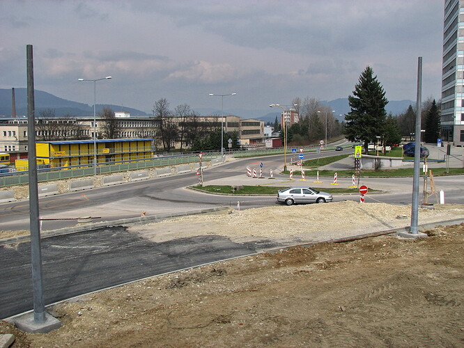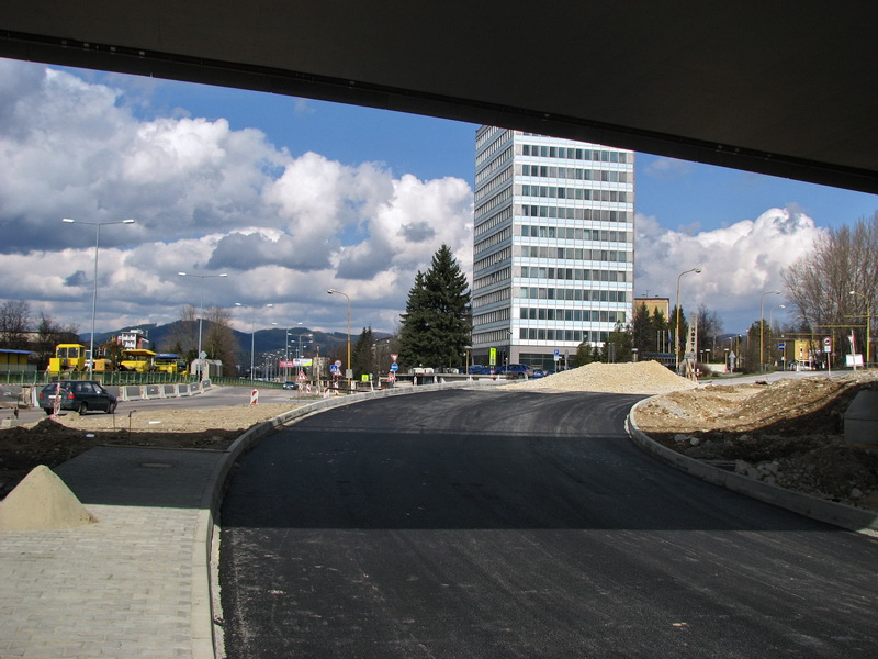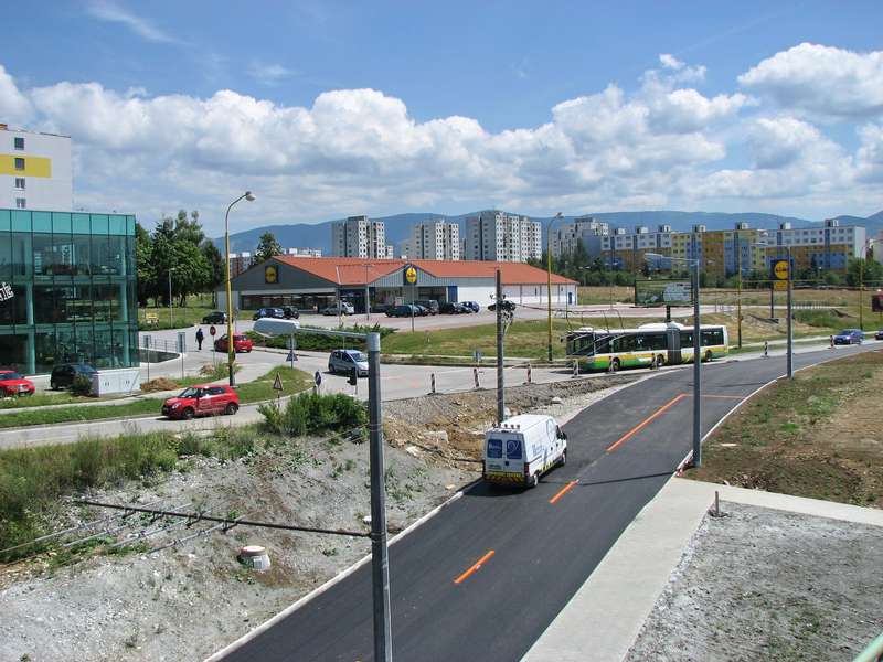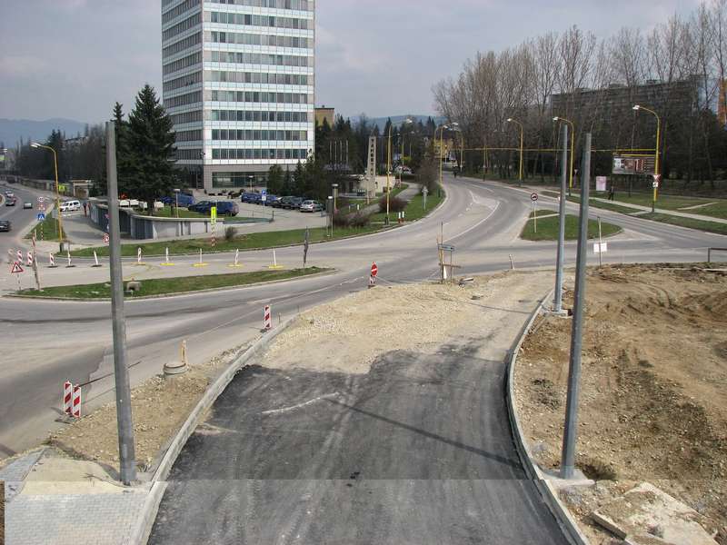 Krátko pred otvorením novej komunikácie s trolejbusovou dopravou ku nedokončenej kruhovej križovatke. Po presmerovaní dopravy bude pôvodná komunikácia vpravo zrušená a kruhová križovatka dokončená, vrátane napojenia z mostného prepojenia ponad DP.