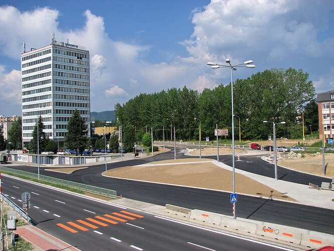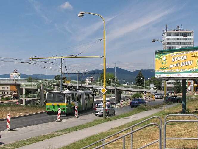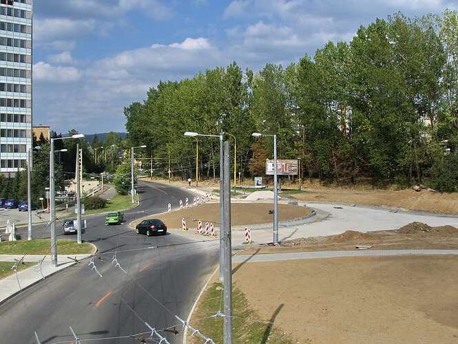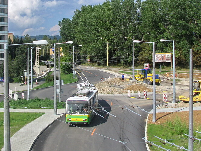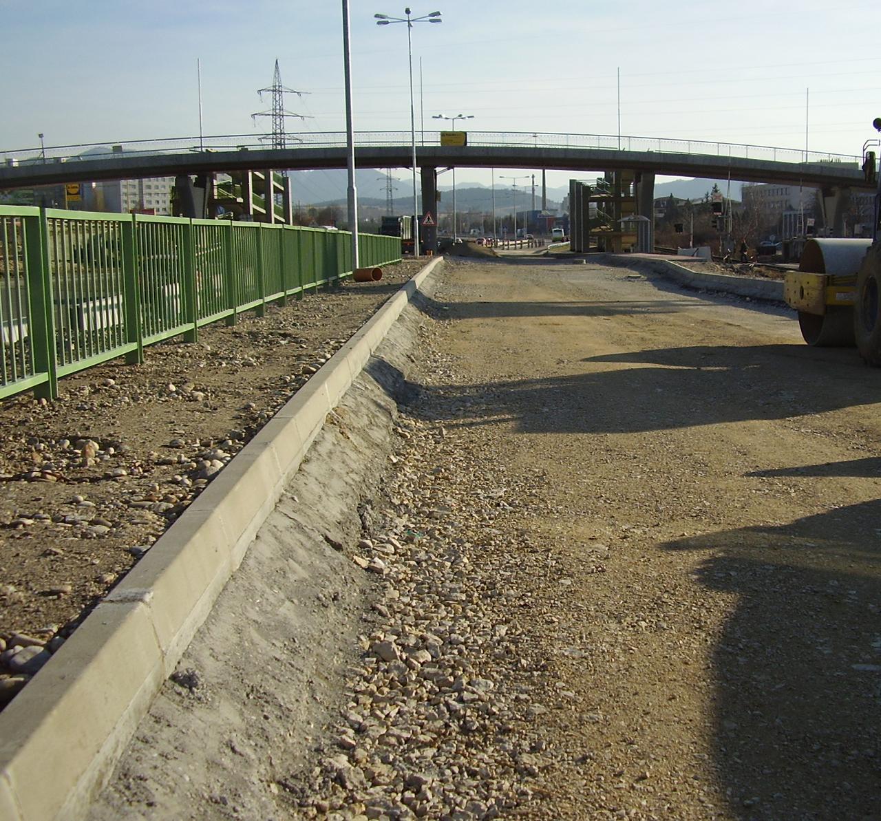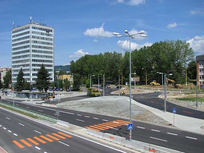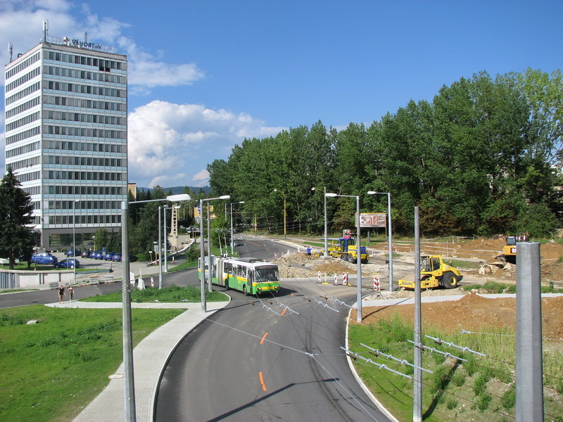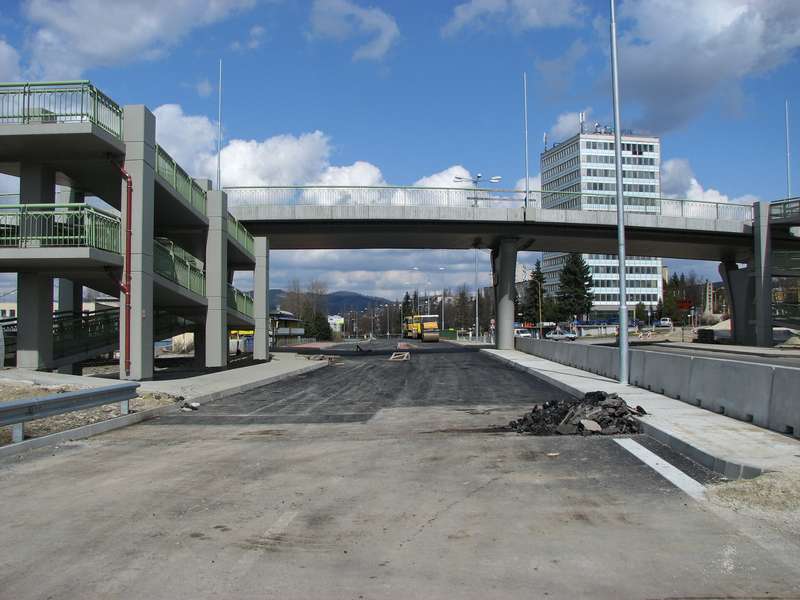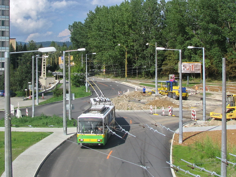 Krátko pred otvorením novej komunikácie s trolejbusovou dopravou ku nedokončenej kruhovej križovatke. Po presmerovaní dopravy bude pôvodná komunikácia vpravo zrušená a kruhová križovatka dokončená, vrátane napojenia z mostného prepojenia ponad DP.