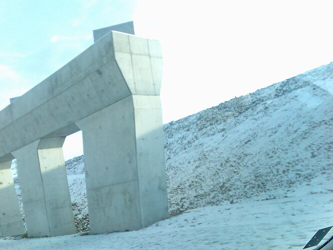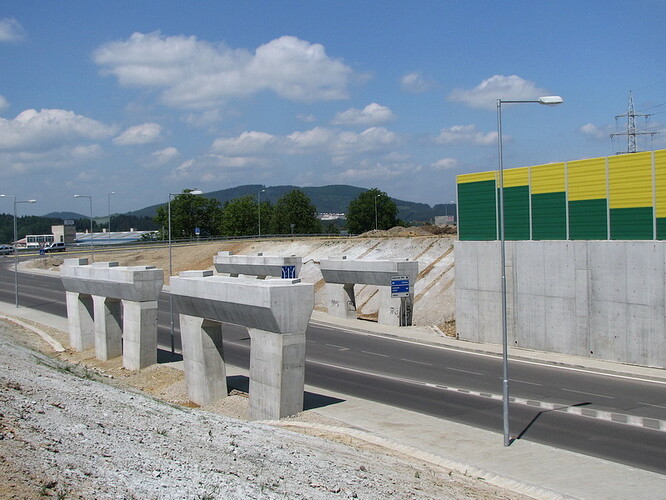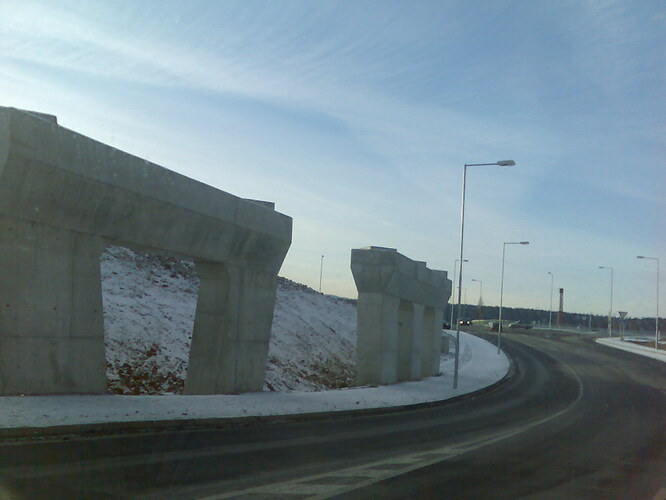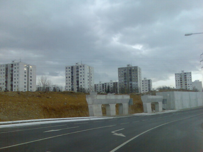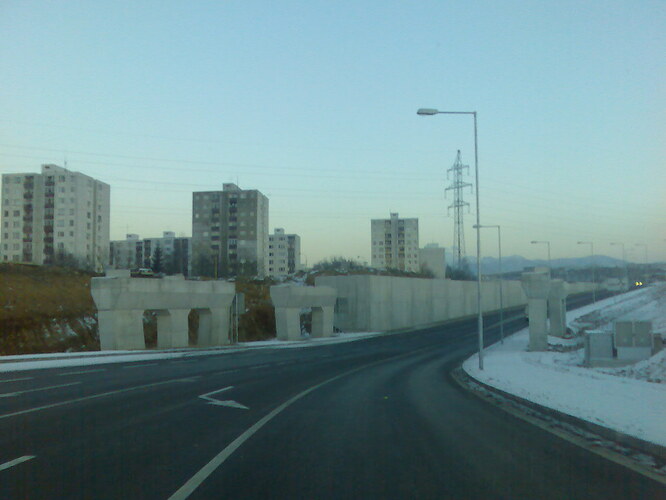 Mostné piliere v križovatke Solinky pripravené pre DP smerom do Lietavskej Lúčky. Úsek DP z centra je dočasne zaústený vpravo hore do úrovňovej križovatky s cestou I/64 a vetvou do kruhovej križovatky.