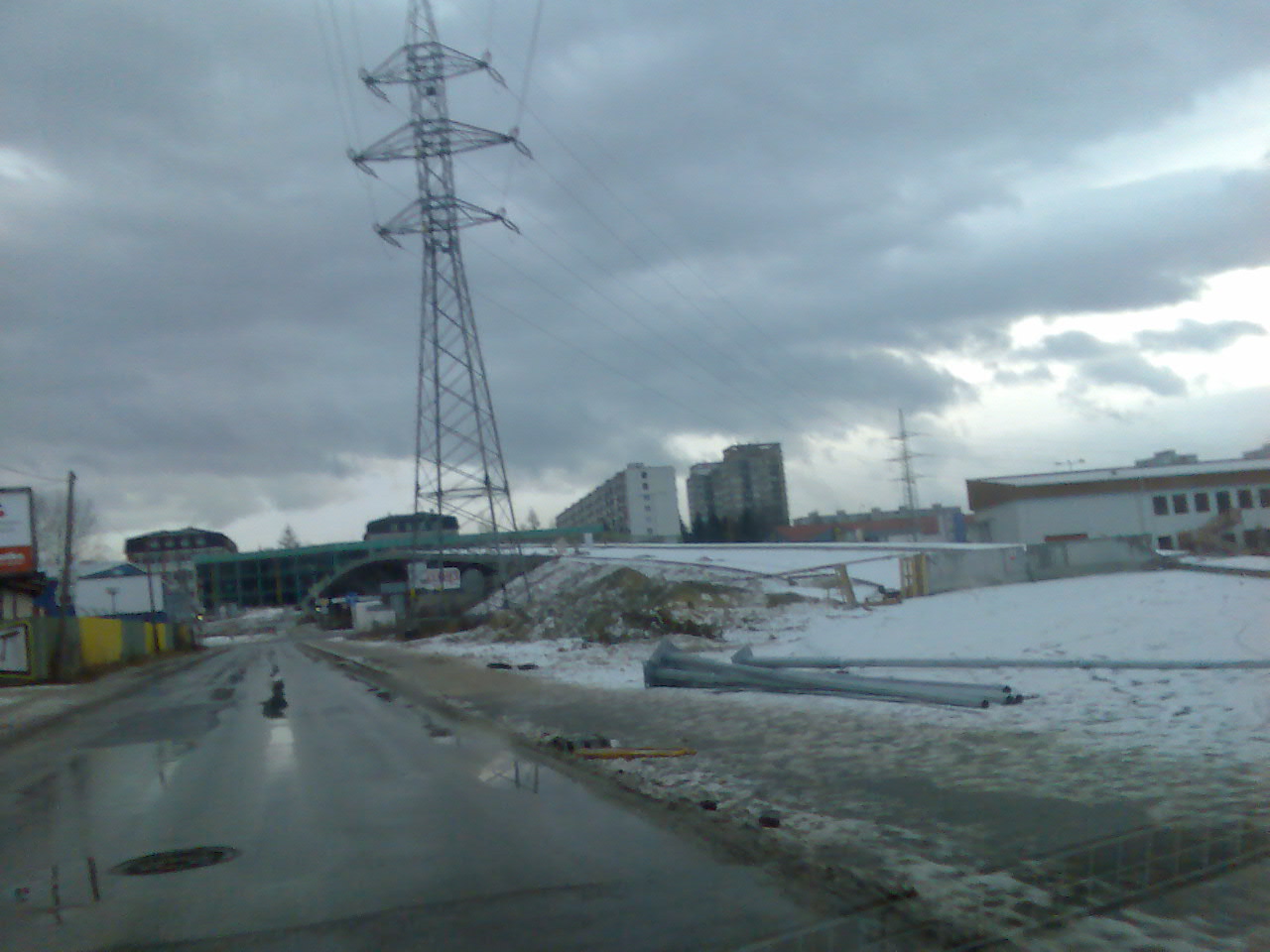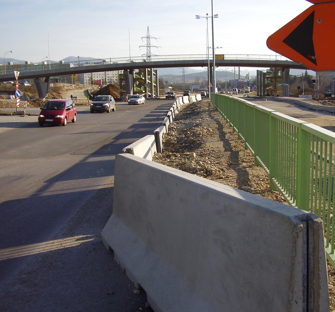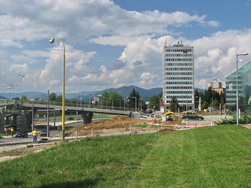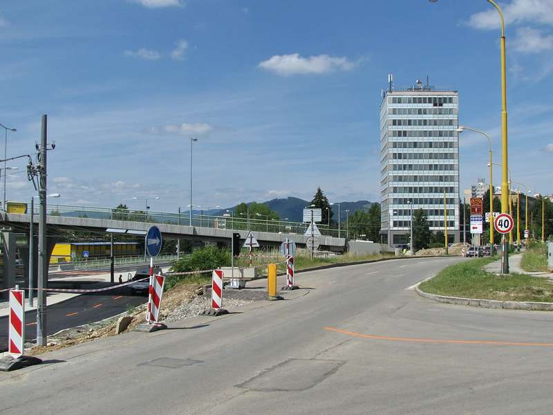 Vľavo prechádza diaľničný privádzač z centra a vpredu je výstavba komunikácie - cestného prepojenia z Obvodovej ul. popod mostné prepojenie z Kamennej ul. smerom na Hlinskú ul. Na tento nový úsek bude presmerovaná aj trolejbusová doprava, kde sú už zabudované trolejbusové stĺpy. Terajší úsek Obvodovej ul. (celkom vpravo) bude zrušený a priestor uvoľnený na zaústenie mostného prepojenia do kruhovej križovatky, ktorá bude vybudovaná na mieste terajšej neprehľadnej križovatky.