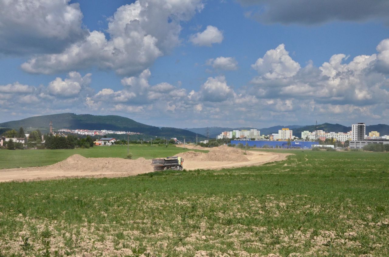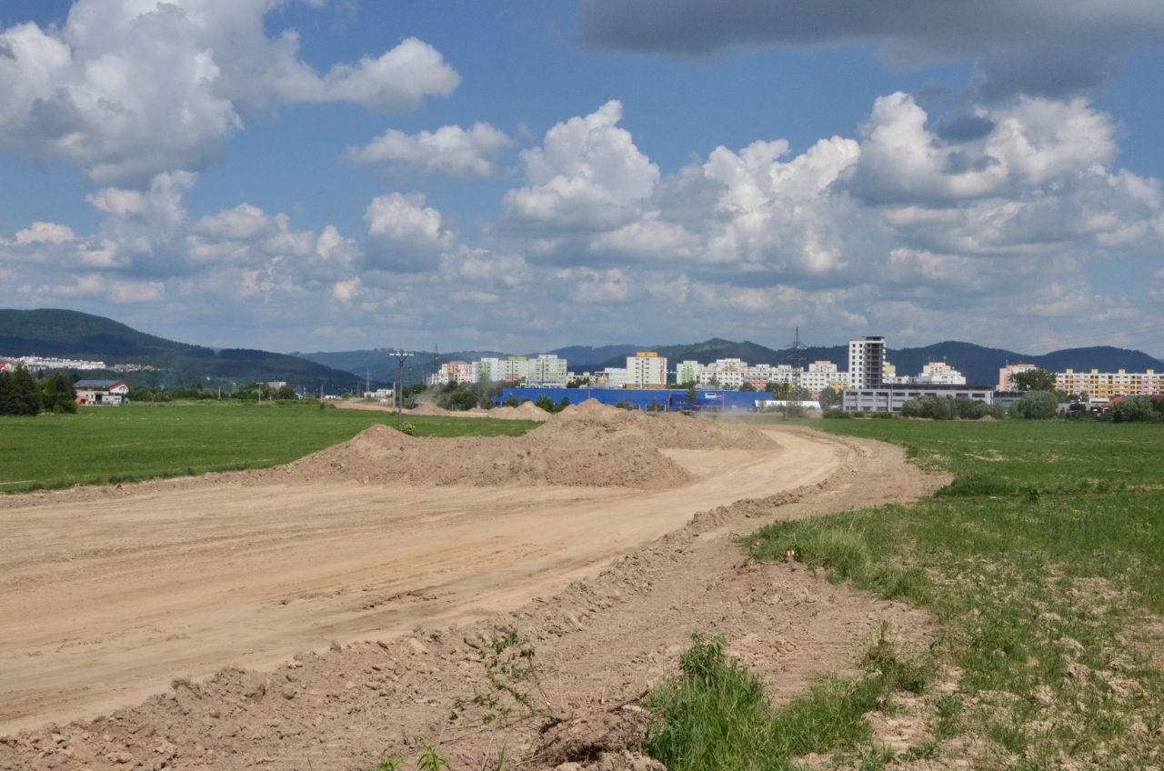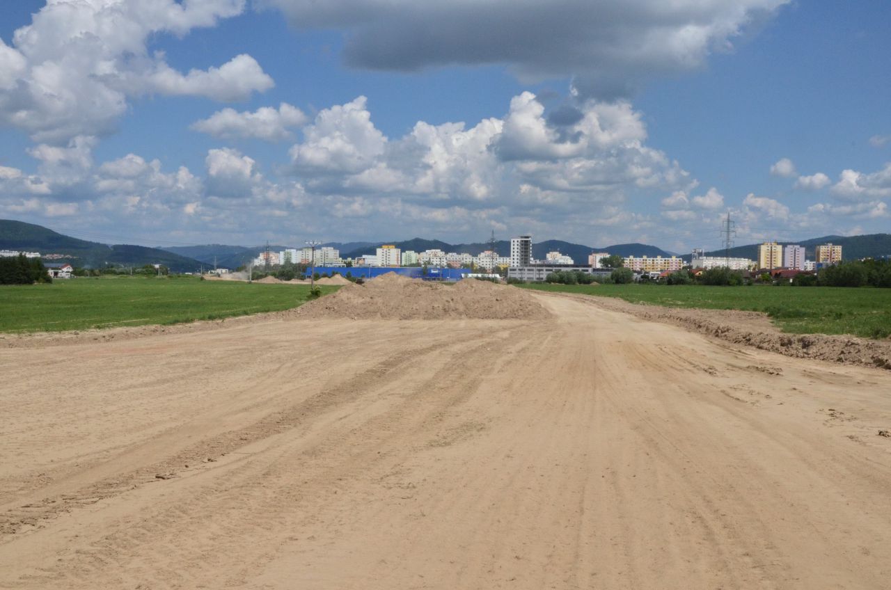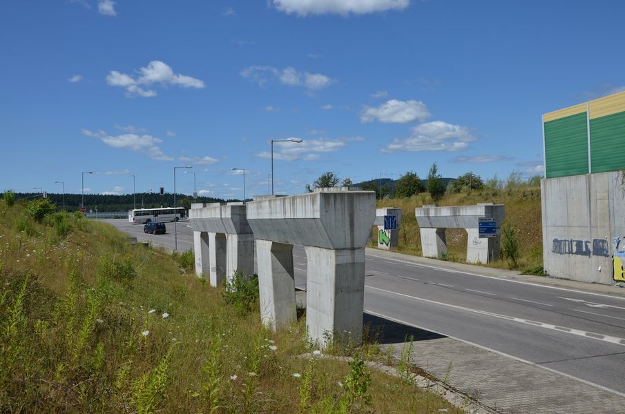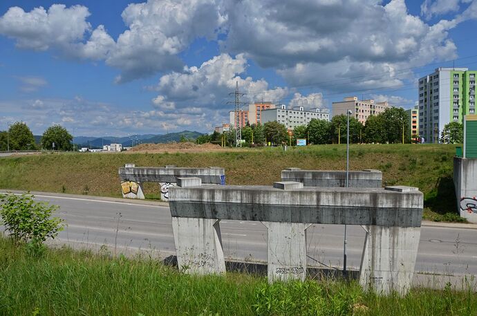 Mostné piliere v križovatke Solinky pripravené pre DP smerom do Lietavskej Lúčky. Úsek DP z centra je pri Solinkách dočasne zaústený vpravo hore do úrovňovej križovatky s cestou I/64.