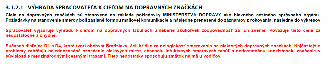 Mimochodom reálnu robotu tejto projekčnej kancelárie je vidieť na novo otvorenom úseku D1 LL - MT. V smere (BA) z tunela Višňové pred výjazdom Žilina-Juh taktiež nesedia šípky s reálnym stavom na vozovke. Obidve predzvesti 500 m aj 1000 m sú znázornené 3 jazdné pruhy aj keď reálne sú tam len 2. Obrázok nemám, nestihol som vyfotiť.