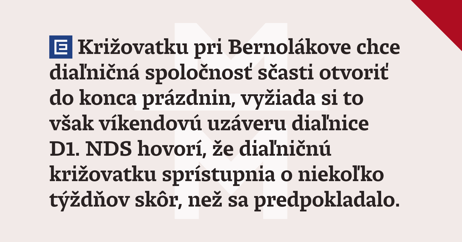 Križovatku pri Bernolákove chce diaľničná spoločnosť sčasti otvoriť do konca prázdnin, vyžiada si to však víkendovú uzáveru diaľnice D1. NDS hovorí, že diaľničnú križovatku sprístupnia o niekoľko týždňov skôr, než sa predpokladalo.