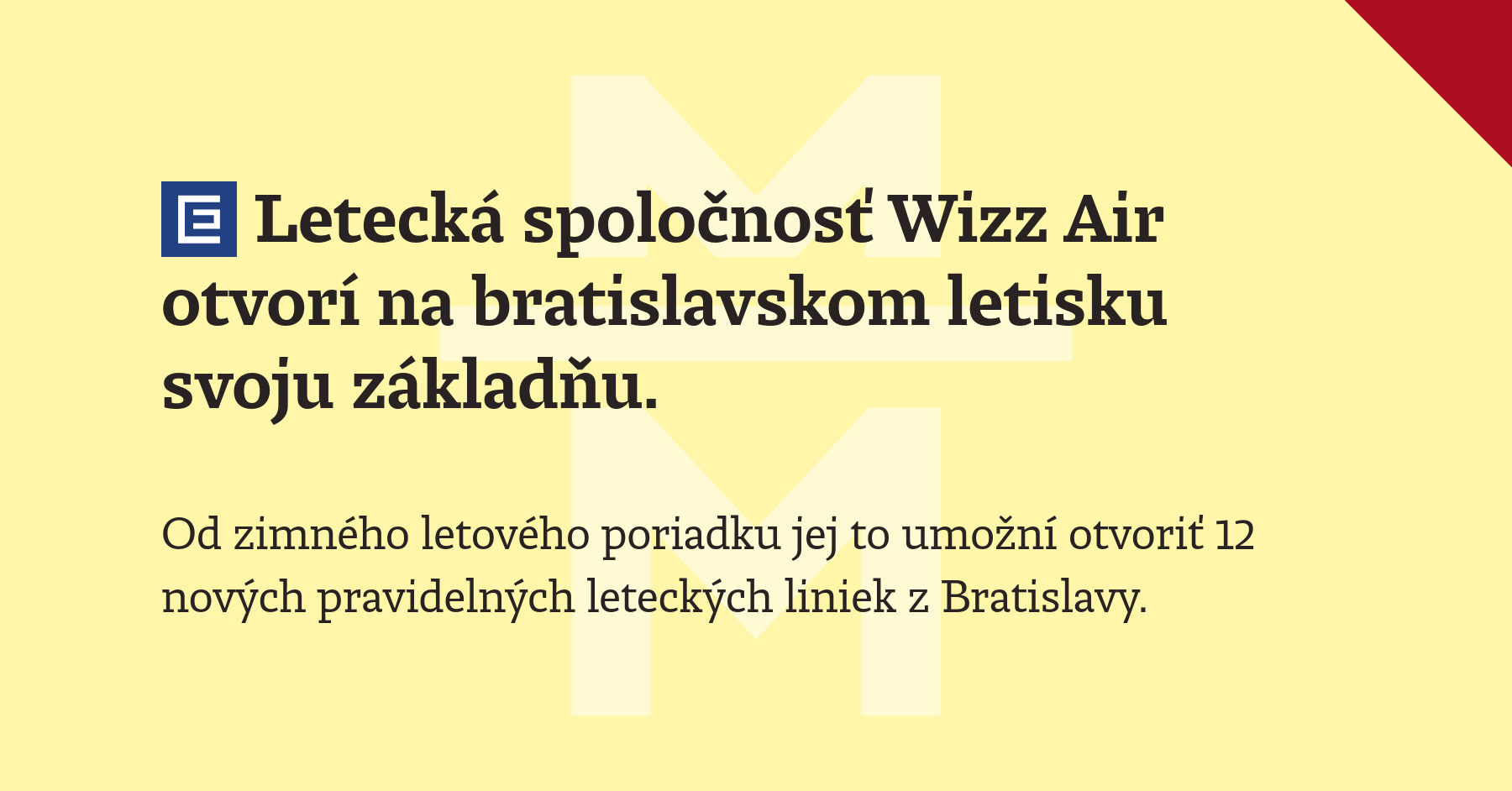 Letecká spoločnosť Wizz Air otvorí na bratislavskom letisku svoju základňu. Plán je mať na nej od zimného letového poriadku dve takzvané bázované lietadlá, čo umožní otvoriť 12 nových pravidelných leteckých liniek z Bratislavy.