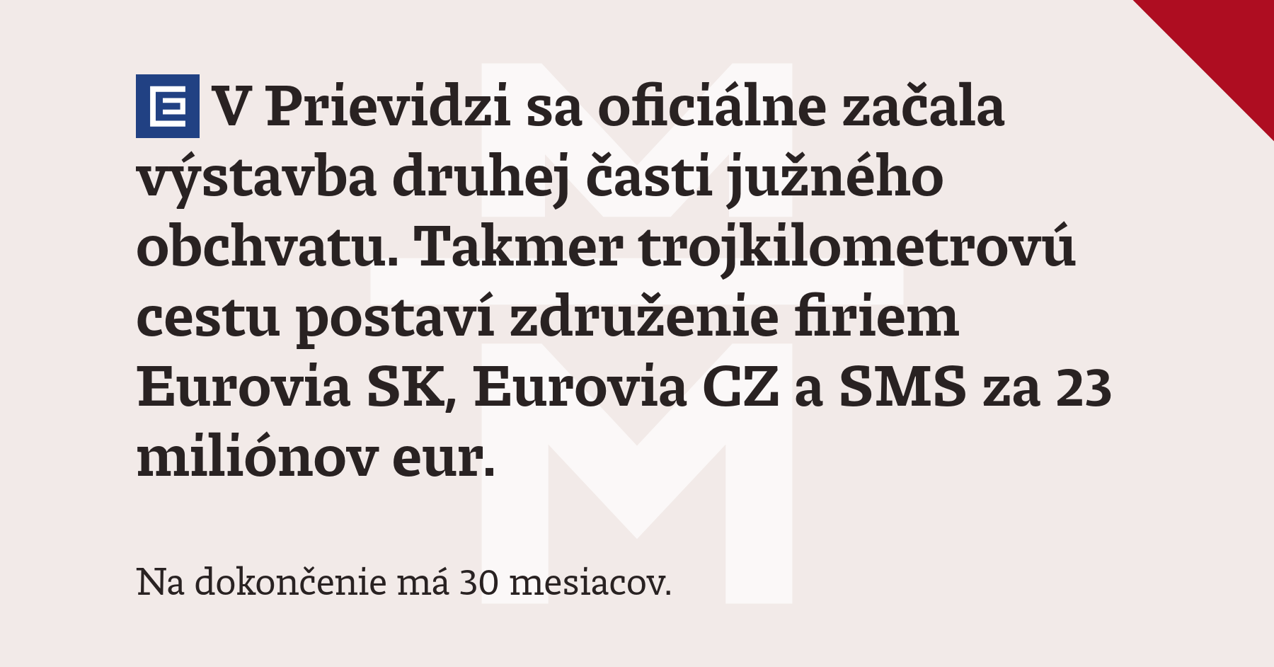 V Prievidzi sa oficiálne začala výstavba druhej časti južného obchvatu. Takmer trojkilometrovú cestu postaví združenie firiem Eurovia SK, Eurovia CZ a SMS za 23 miliónov eur. Na dokončenie má 30 mesiacov.
