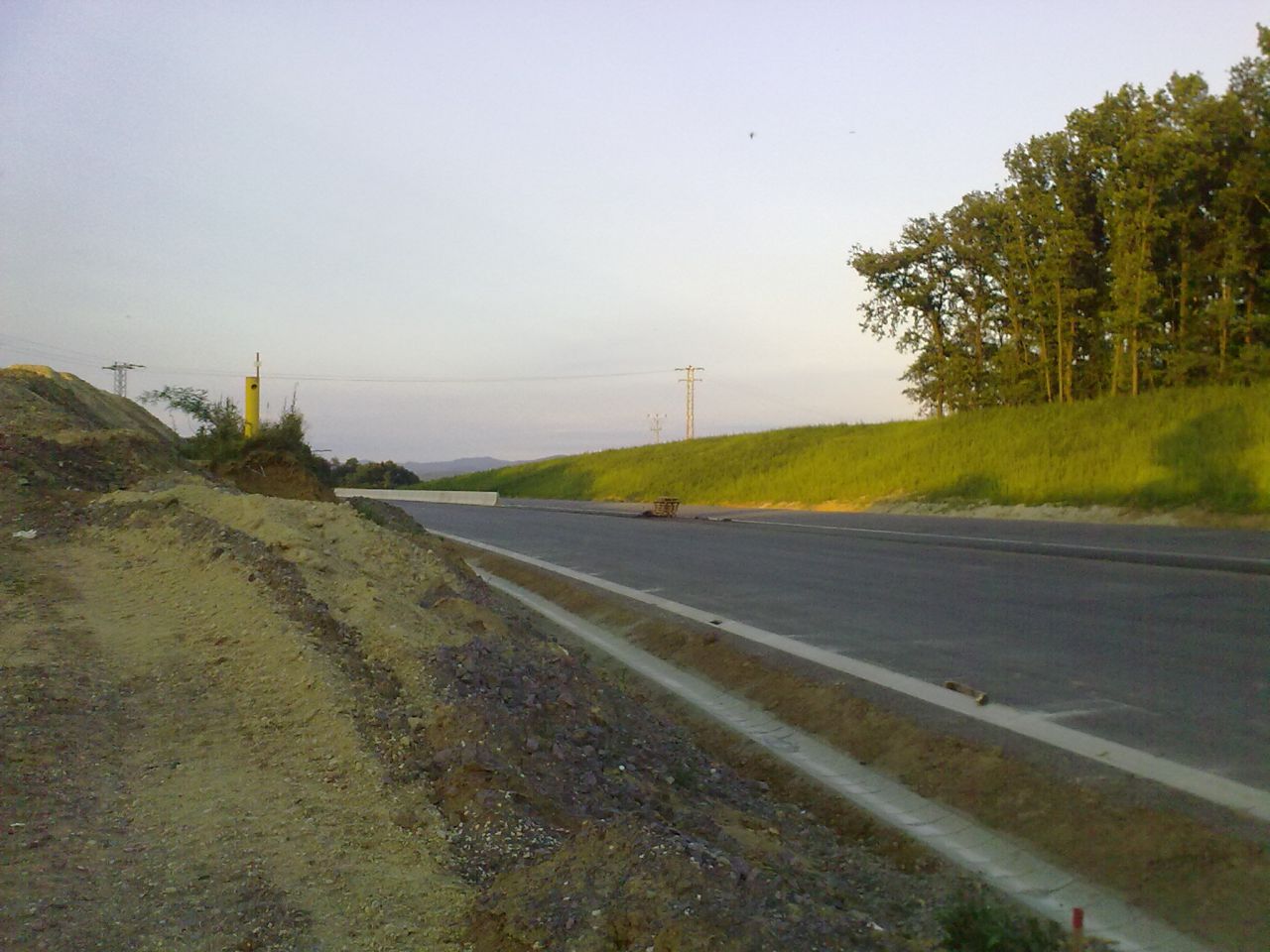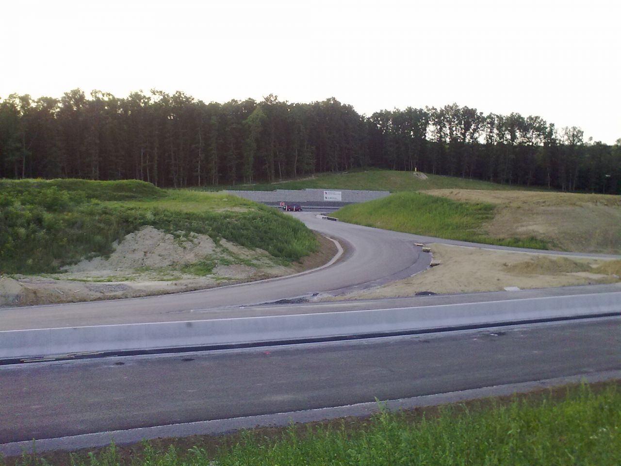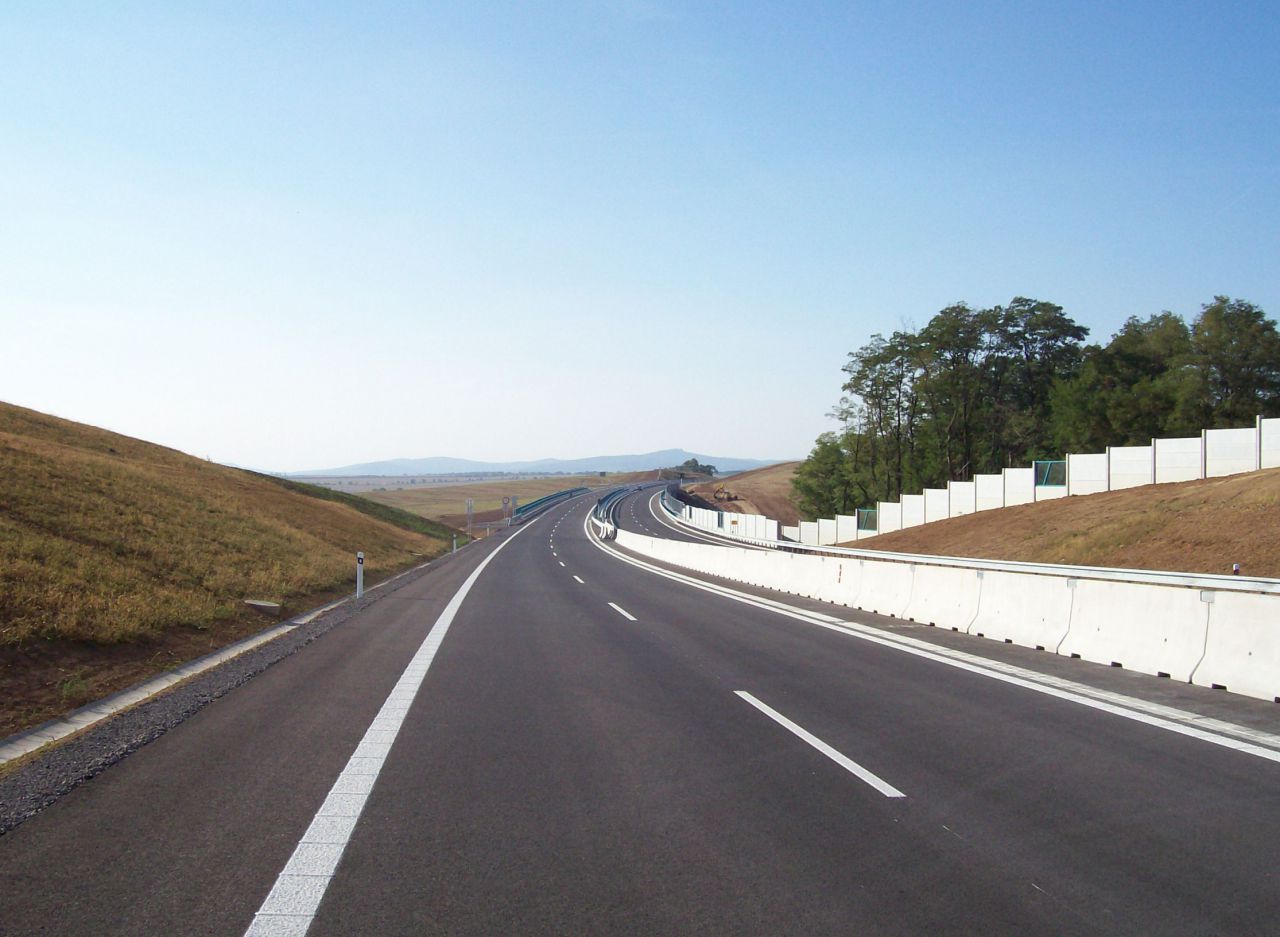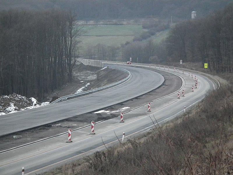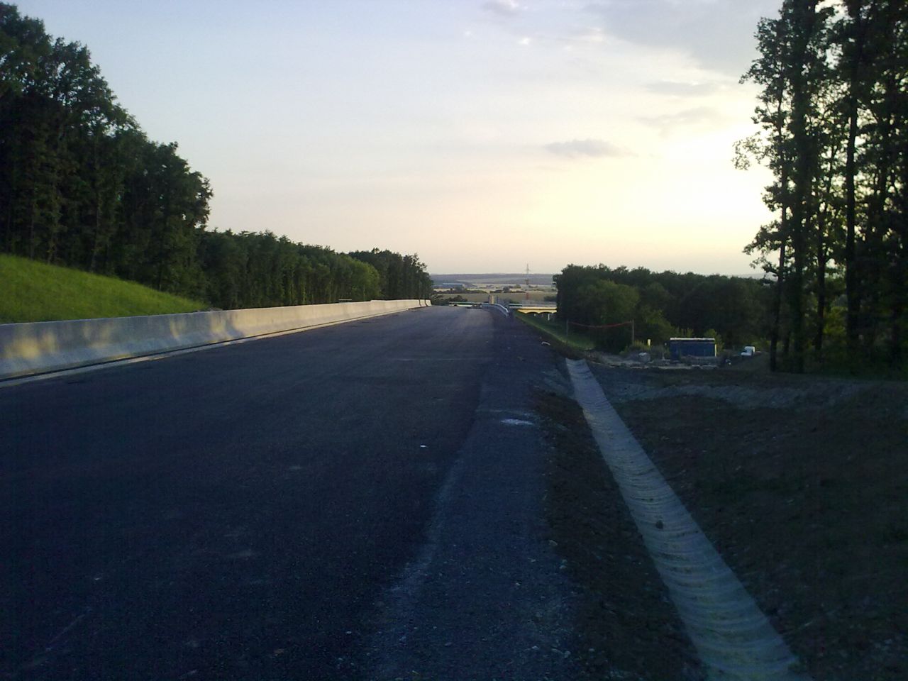 Večerné foto úseku medzi MÚK Čaradice a odpočívadlom Tekovské Nemce. Betónové zvodidlá sú už vybudované, AB kryt položený aj polprofile ZV-NR