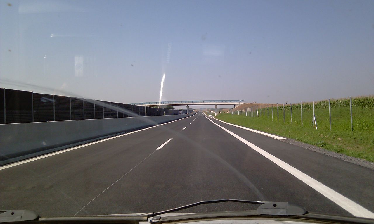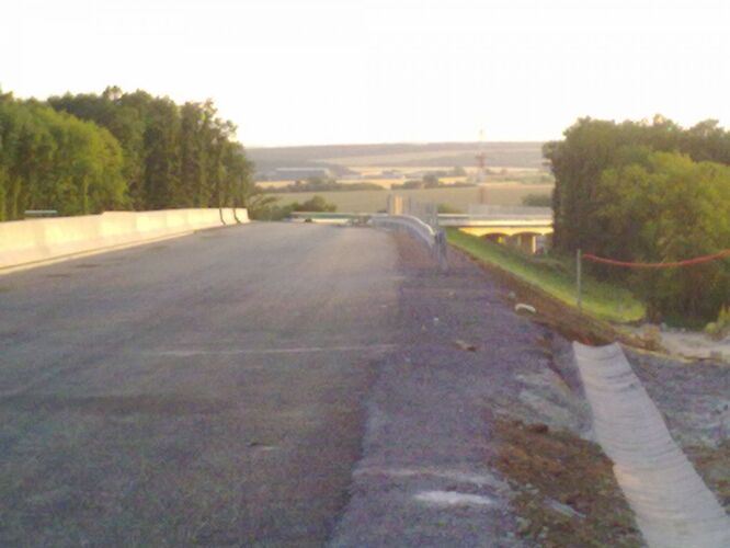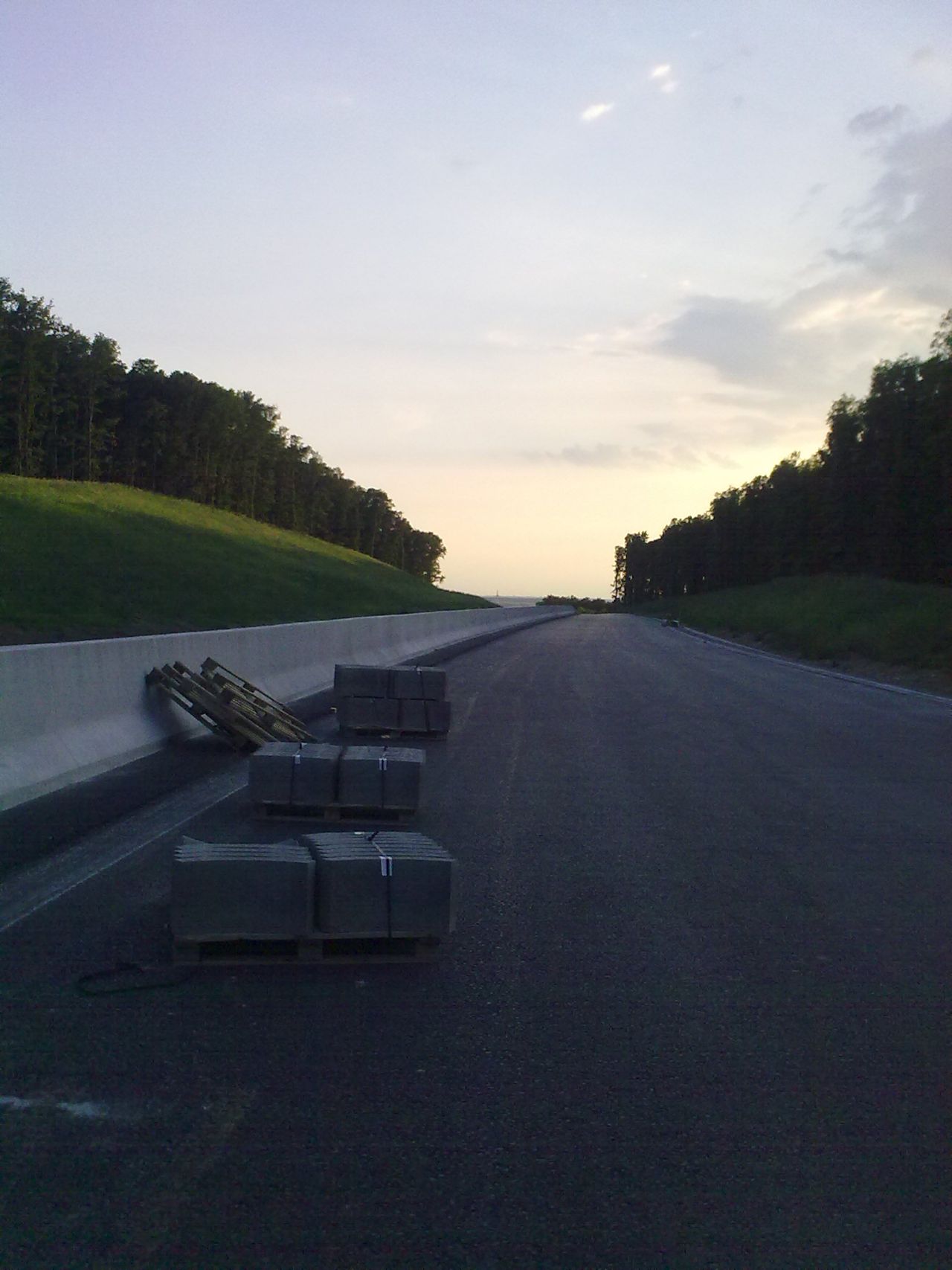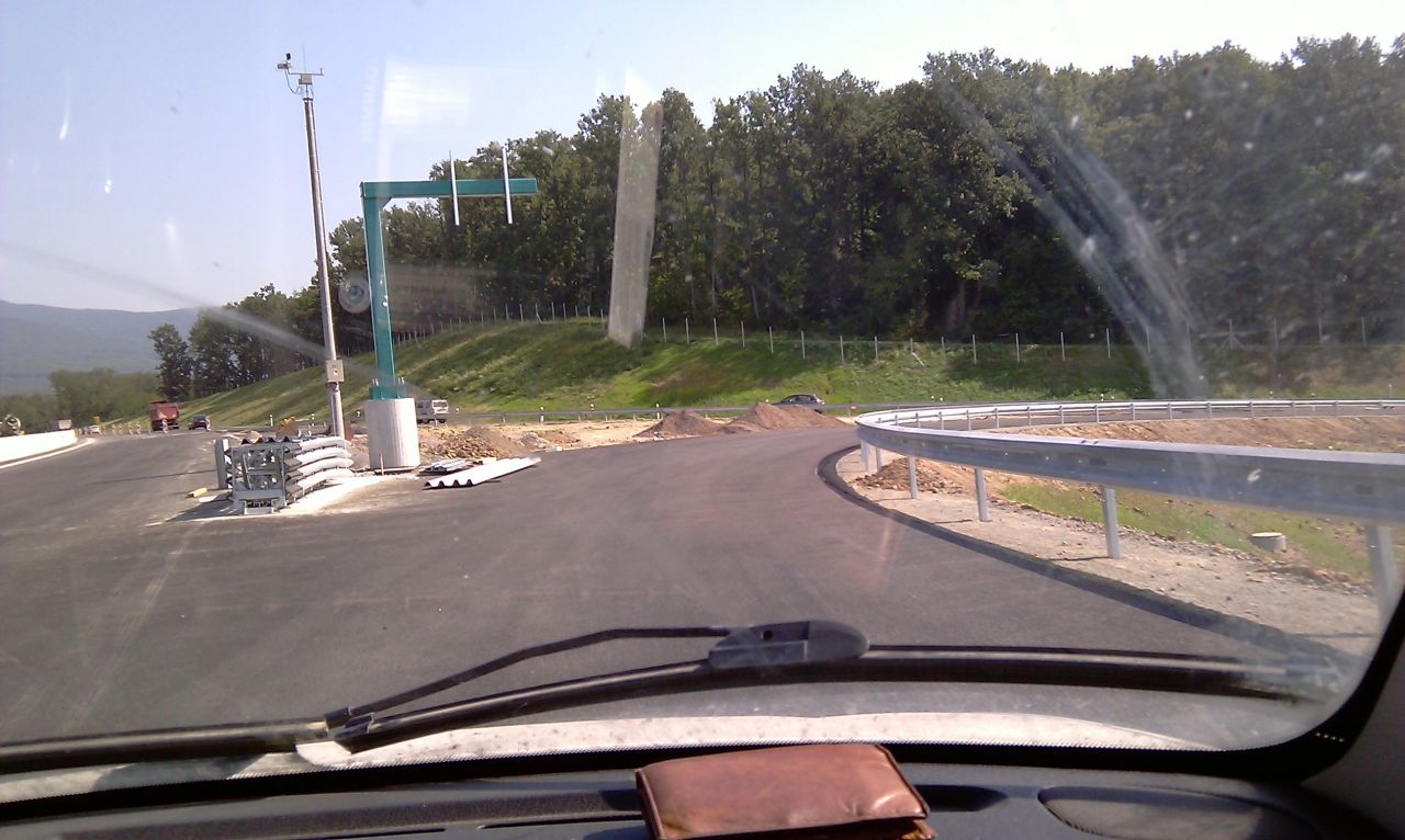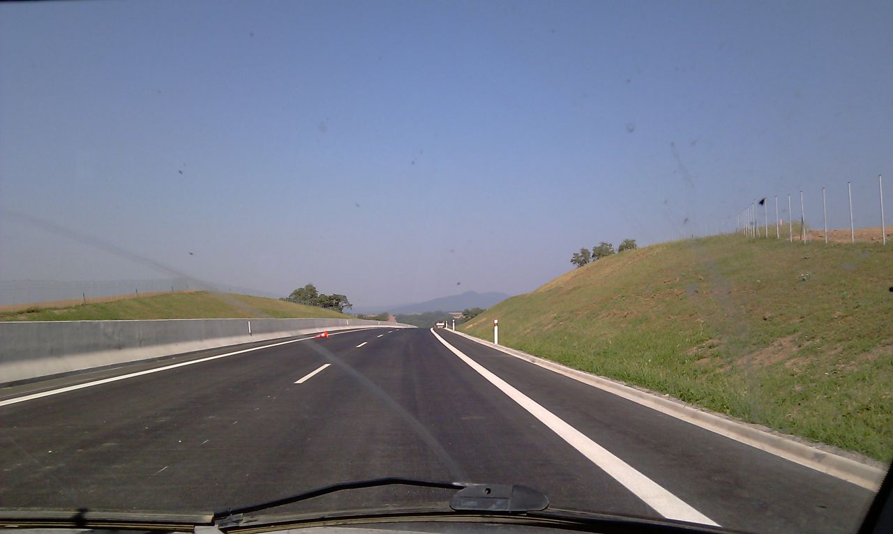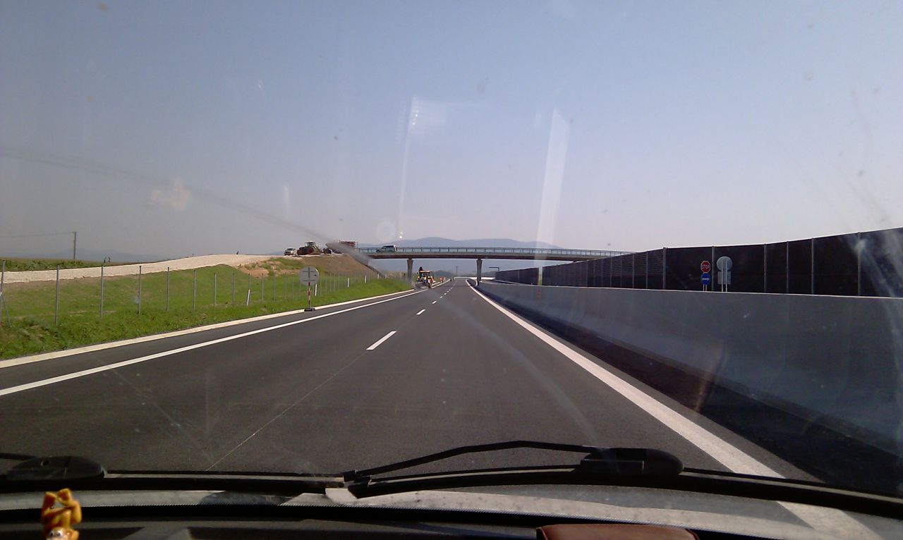Večerné foto úseku medzi MÚK Čaradice a odpočívadlom Tekovské Nemce. Betónové zvodidlá sú už vybudované, AB kryt položený aj polprofile ZV-NR