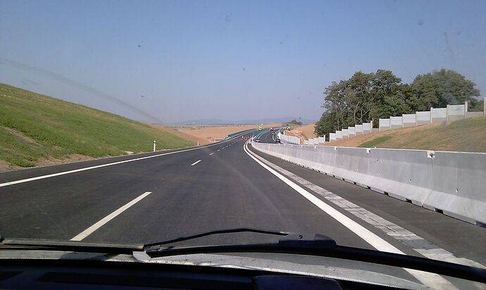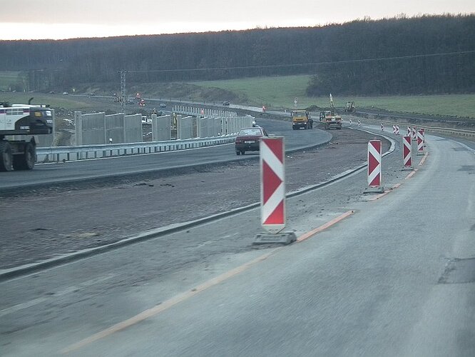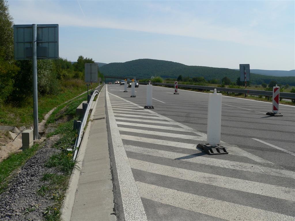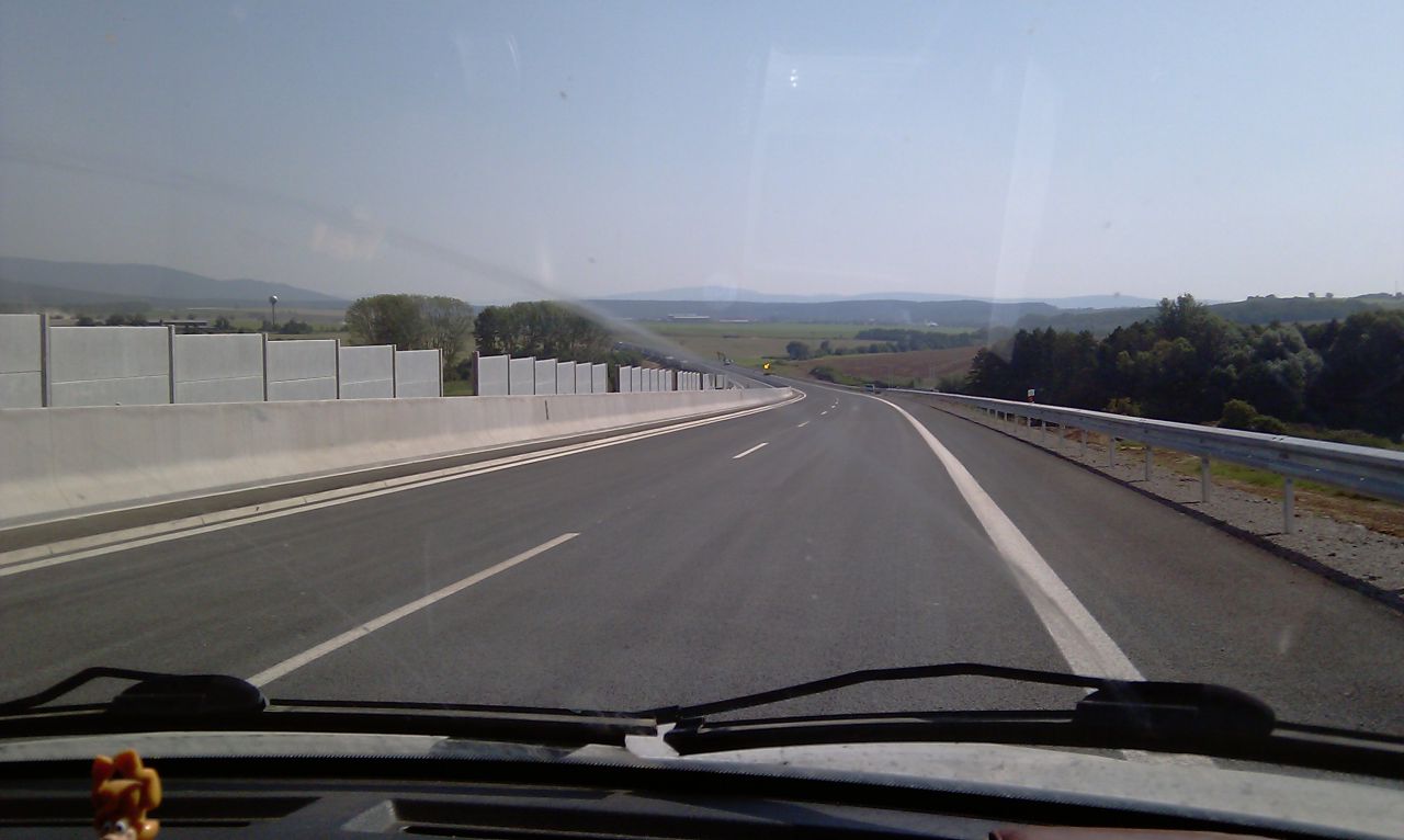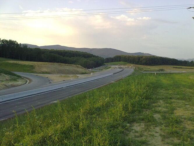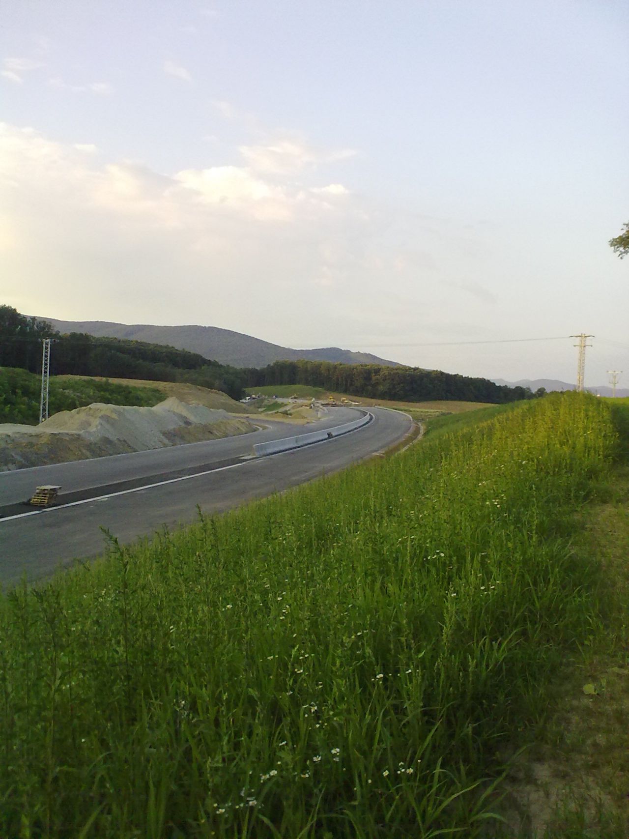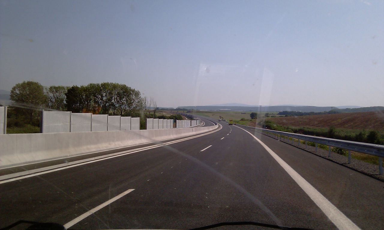 Večerné foto úseku medzi MÚK Čaradice a odpočívadlom Tekovské Nemce. Betónové zvodidlá sú už vybudované, AB kryt položený aj polprofile ZV-NR