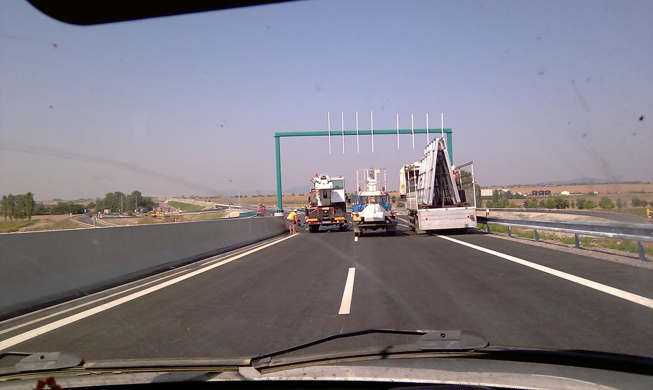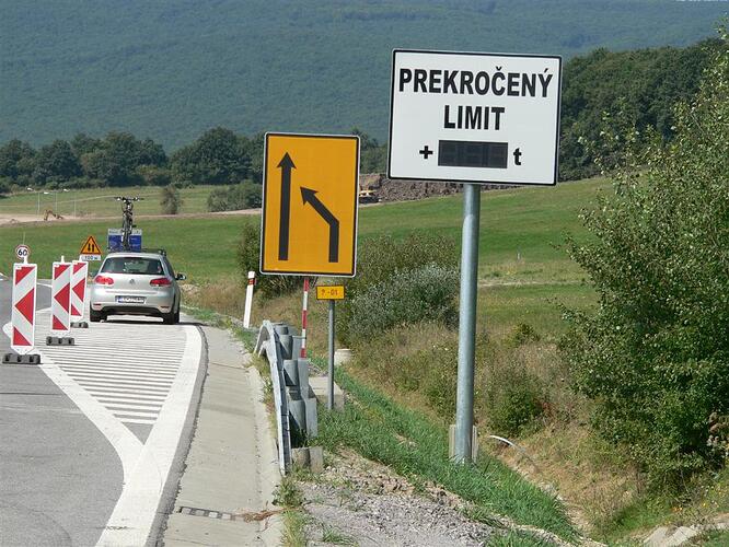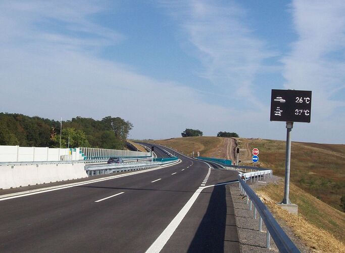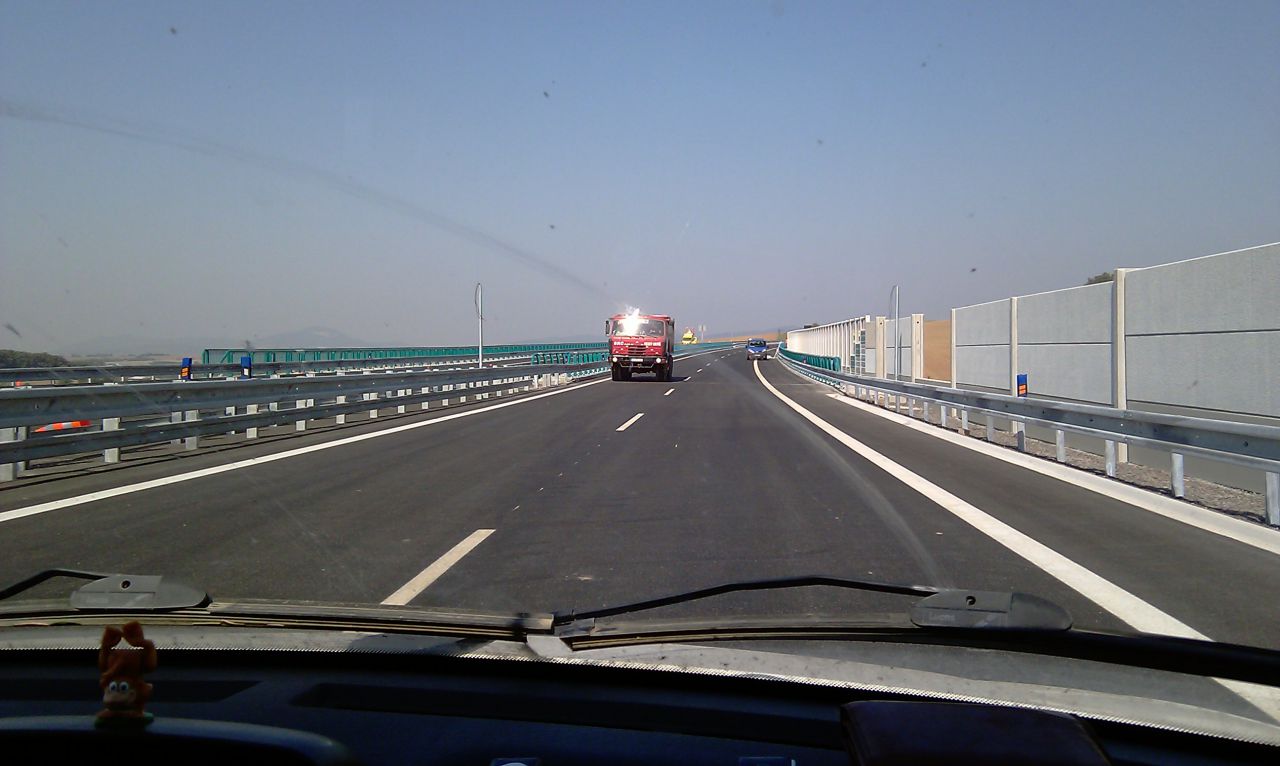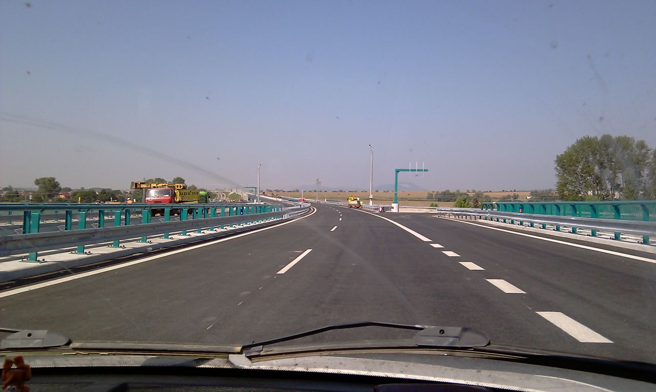 smer NR, napravo su vinice Čierne Kľačany, vzadu za mostom su elektronicke tabule, premnelive znacenie.