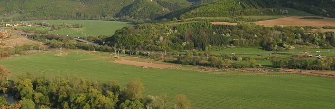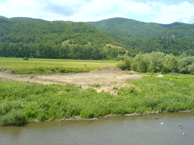 Tu by už bolo načase zakladať piliere mosta cez Hron. V pozadí zrúcanina hradu Revište