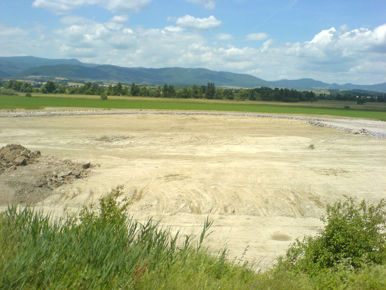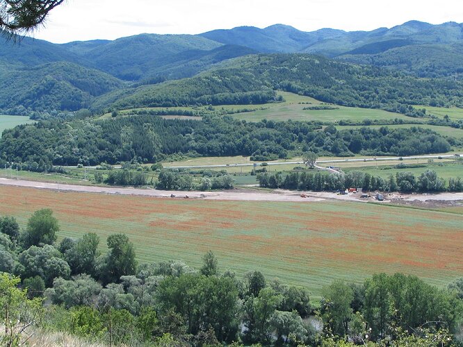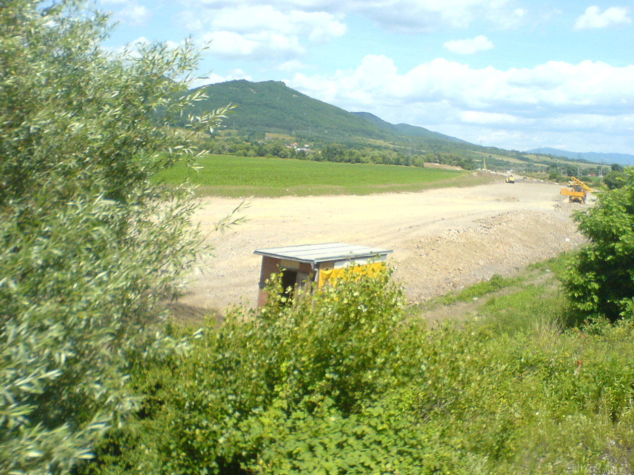Práce na R1 medzi Hliníkom nad Hronom a budúcou MÚK Lehôtka pod Brehmi. Tu bude pravdepodobne stáť menší most, preto rozostavaný násyp zatiaľ končí