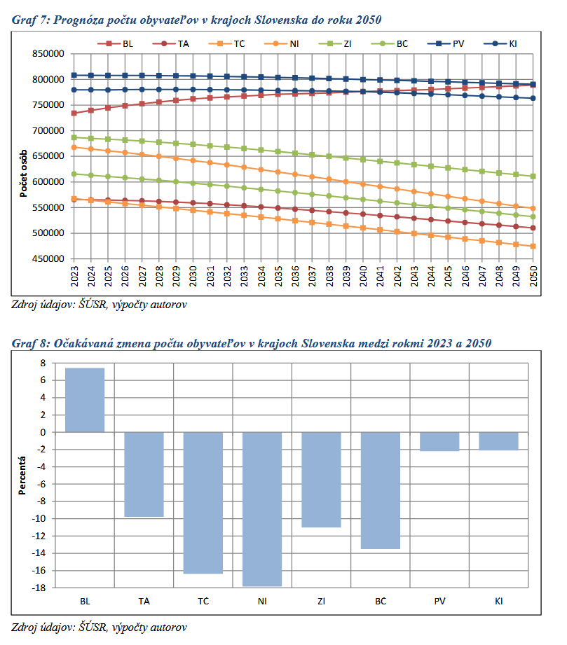 Tu je studia ohladne poctu obyvatlov v roku 2050 voci roku 2023. Jediny kraj, ktoremu narastie pocet obyvatelov je Bratislavsky. Tam odhaduju narast o 8%. Vsetky ostatne kraje maju pokles poctu obyvatelov. Najviac ma klesnut Nitriansky kraj az o 18%