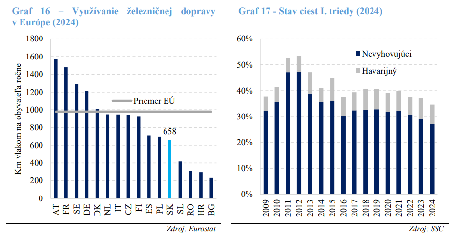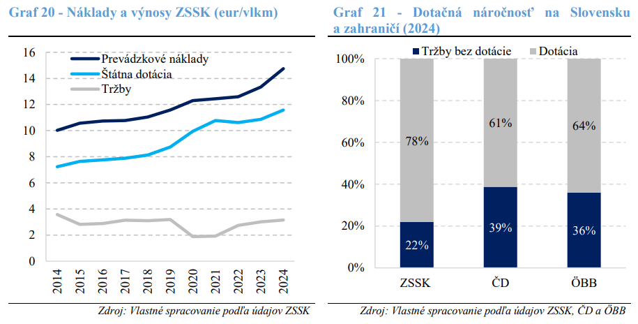 V návrhu je aj porovnanie, ktoré ukazuje, že kým náš štátny dopravca získal od cestujúcich v minulom roku 22 percent svojich príjmov, v Rakúsku to bolo 36 percent a v Česku až 39. Najazdené kilometre v prípade vlakov síce v posledných rokoch pribúdajú, stále sú však oproti európskemu priemeru na nízkej úrovni.