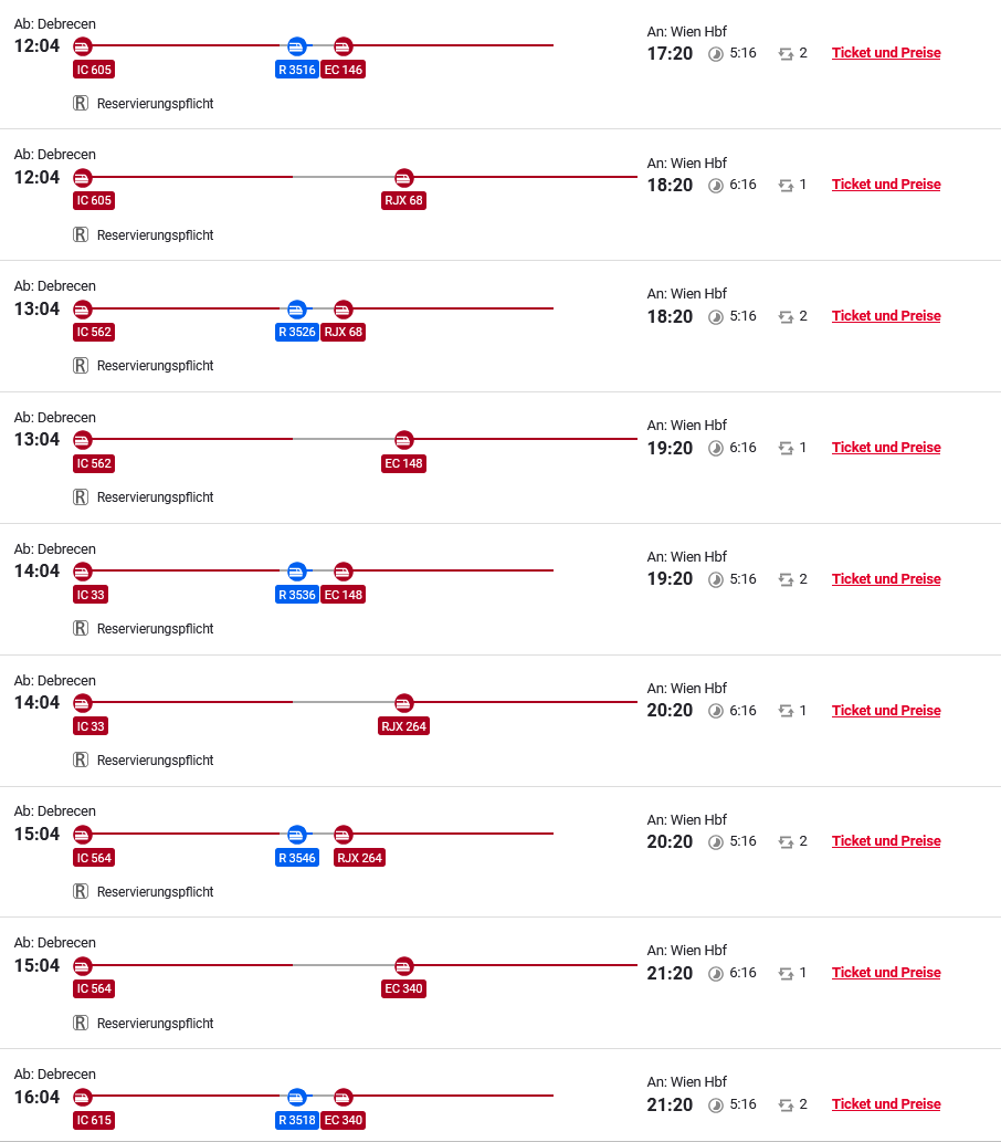 Zase si nasiel presne priklad toho, co hovirm ja. Lebo toto tuna je len jeden exot vlak priamy Debrecen - Vieden. Ale to nie je vobec zajimave, lebo na Debrecen - Vieden je v skutocnosti hodinovy takt (aj ked na 2 prestupy) a cela cesta trva 5h15, cize presne tak ako ja navrhujem pre KE-W (kludne aj s prestupom v BA) :